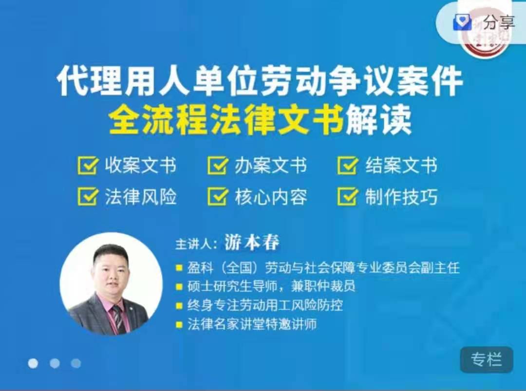 【法律更新】【法律名家】《游本春:代理用人单位劳动争议案件全流程法律文书解读》对代理用人单位劳动争议案件所需的每一份法律文书制作要点、核心内容、注意事项、风险防控等进行全方位的讲解。 ●法律会员免费,需要私聊 ●路径/03/2021/295