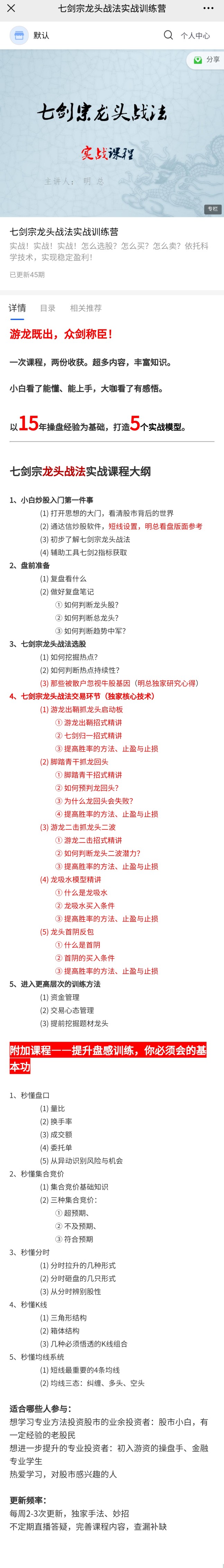 由浅深入,层层推进,让白小看了秒能懂,让高看手了有发启。每周新更2-3个视频,保确大家到学的内容,跟紧市场奏节。明总把经最典案例最与新的子例相结合,让大家即即学用,获最得深感的悟,具最效的用知识。精讲5实个战模型,至少10关个键核内心容。这过个程将你学到:何如用剑七底部出选大妖股,如何将头龙从头吃到尾,最专业的态心管理、最稳的定资金理管,最后,再附上加一套感盘训练。
