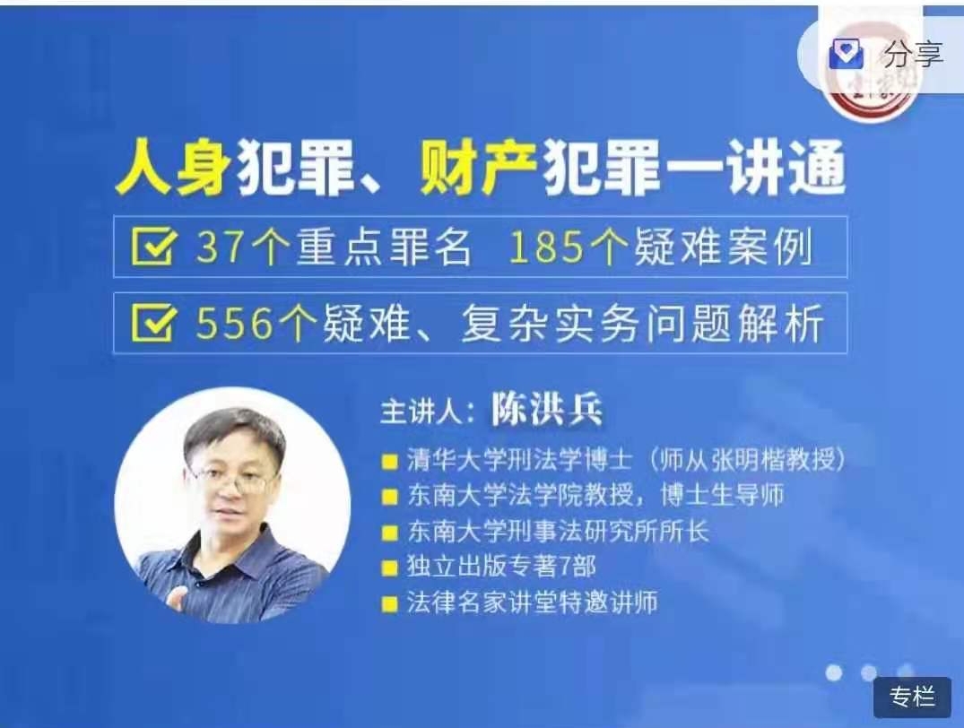 【法律更新】【法律名家】陈洪兵:人身犯罪、财产犯罪一讲通 ●法律会员免费,需要私聊 ●路径/03/291 37个重点罪名,185个疑难案例,556个疑难复杂实务问题解析。时长约14小时,陈洪兵教授主讲。