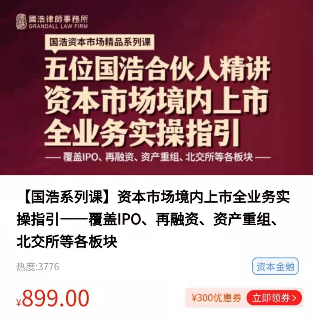 【法律上新版本二】【智拾】《资本市场境内上市全业务实操指引》这是一套由国浩资本市场精英团队亲授的重磅大课,主攻资本市场境内上市全业务法律实务难点,共计近10小时,覆盖IPO、再融资、资产重组、北交所等关键环节,致力于讲透不同板块上市及上市后法律重难点问题。 ●法律会员免费,需要私聊 ●路径/14/163