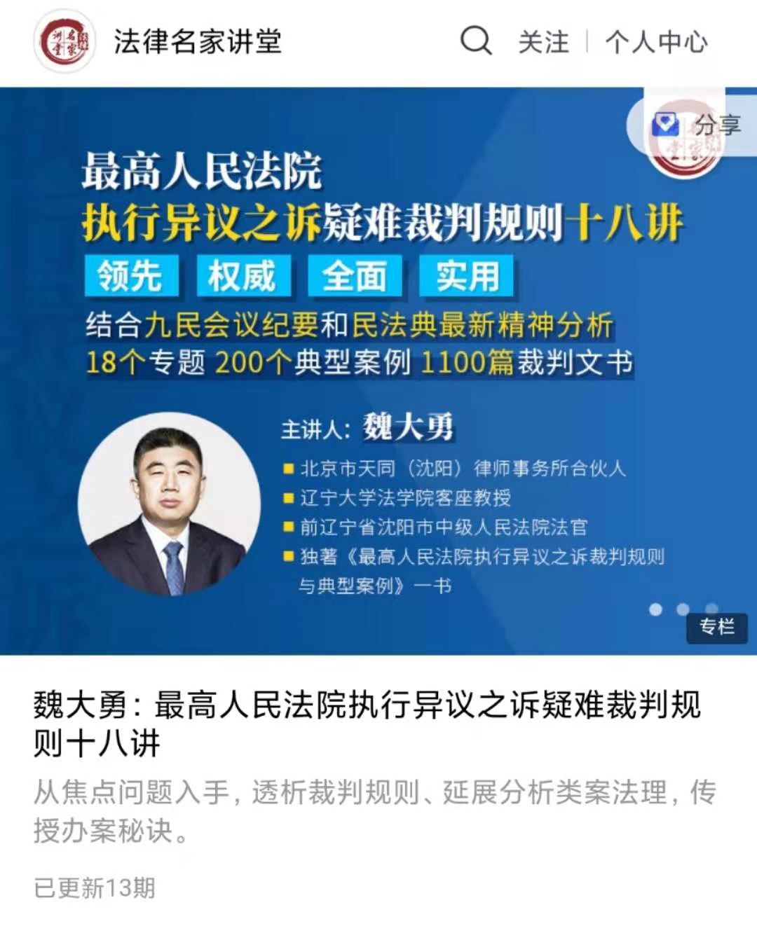 【法律更新】【法律名家】 《魏大勇:最高人民法院执行异议之诉疑难裁判规则十八讲》从焦点问题入手,透析裁判规则、延展分析类案法理,传授办案秘诀。 ●法律会员免费●路径/03/2021/189