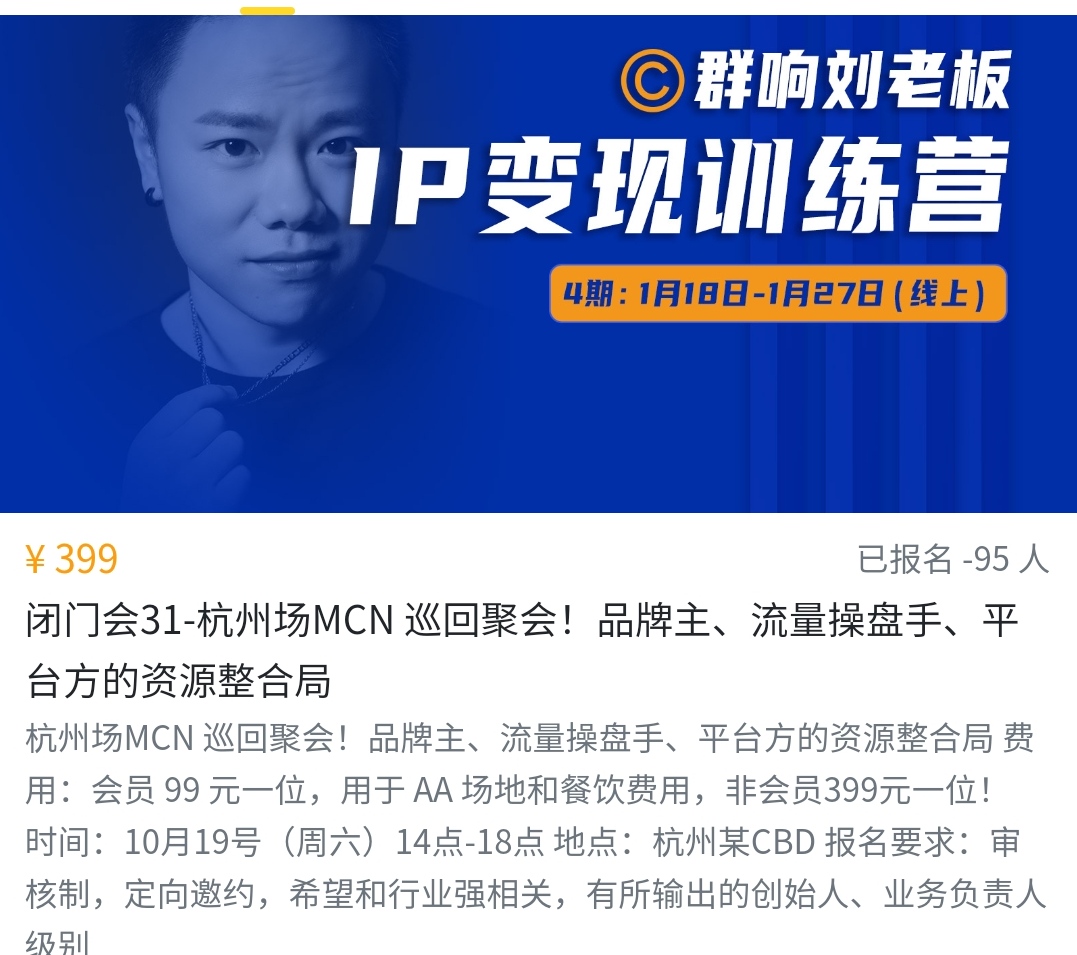 杭州场MCN 巡回聚会!品牌主、流量操盘手、平台方的资源整合局 费用:会员 99 元一位,用于 AA 场地和餐饮费用,非会员399元一位! 时间:10月19号(周六)14点-18点 地点:杭州某CBD 报名要求:审核制,定向邀约,希望和行业强相关,有所输出的创始人、业务负责人级别