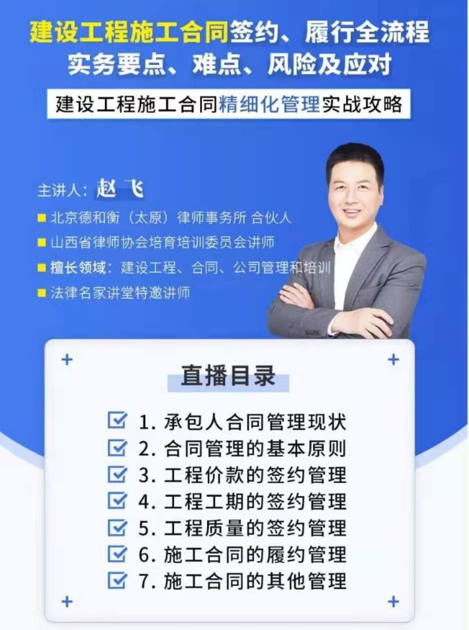 《赵飞:建设工程施工合同签订和履约管理实务》工程行业乃至所有行业无不奉行业务为王的宗旨,的确,没有业务不可能生存,更何谈发展。但是,“所有的业务关系终都是法律关系”“所有的风险终都是法律风险”,不遵守法律的规则,业务带来的可能不是利润也不是业绩,而是风险、债务、法律责任。