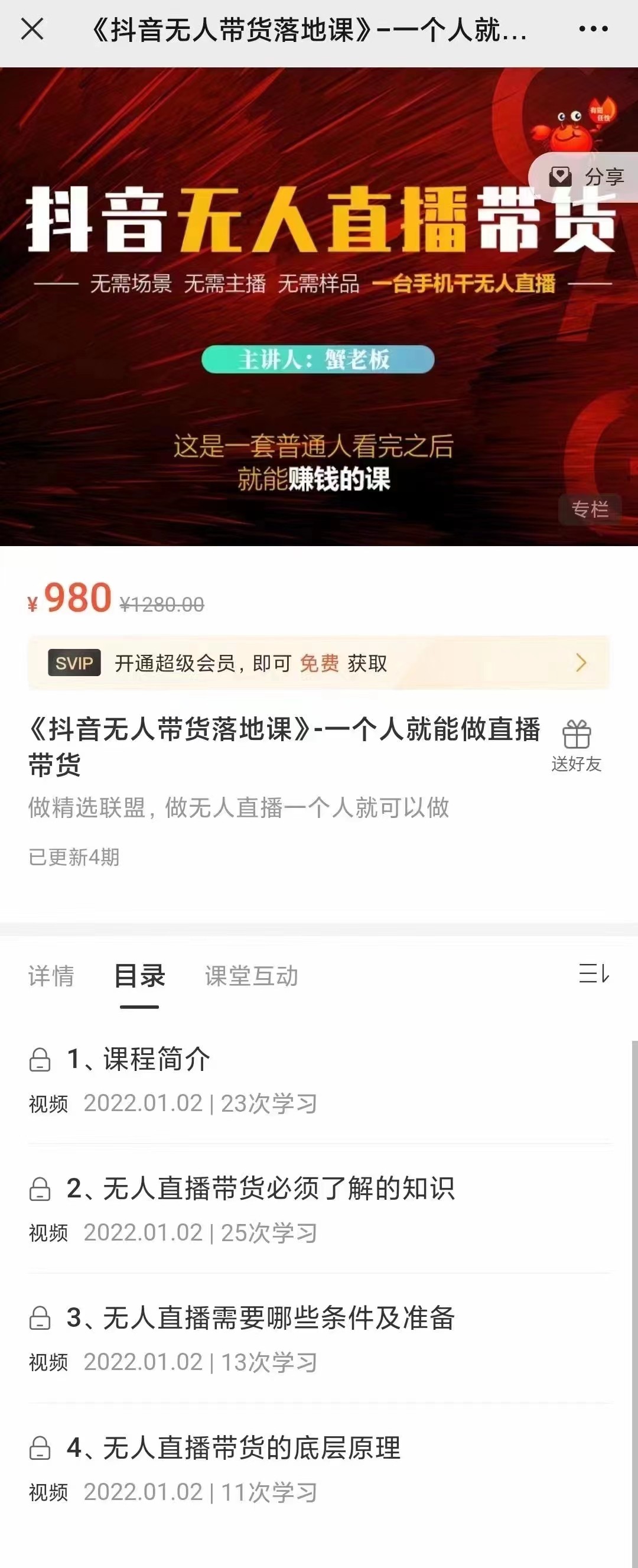 【网赚上新】《蟹老板抖音无人直播带货 》 ●网赚2/抖音快手/754 ●网赚会员免费。 一个人就能做直播带货 2022年无人直播最新课程 1、无人直播课程简介 2、无人直播带货前必须要了解的知识 3、无人直播需要哪些条件及准备 4、抖音无人直播带货底层原理 5、电脑无人直播演示及巨量百应操作 6、使用手游模式开无人直播 7、无人直播带货起号方法